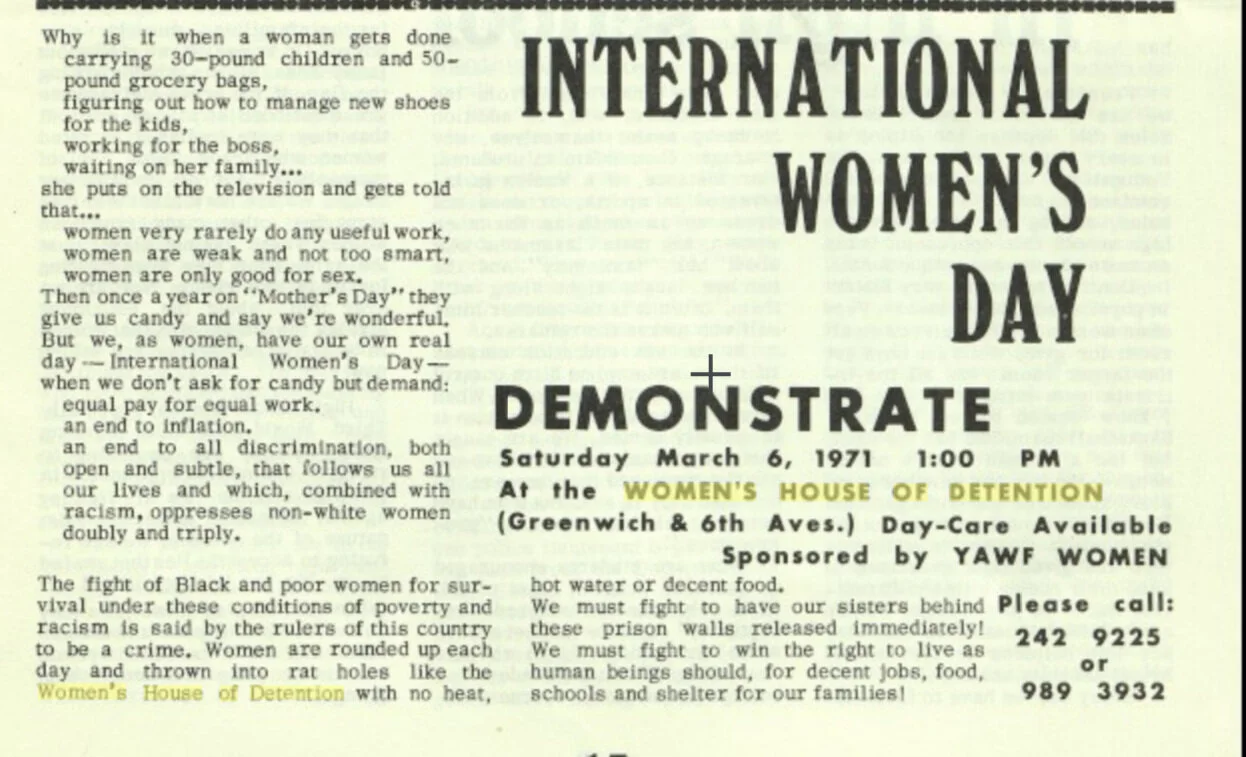 Advertisement for a 1971 anti-House of D protest by YAWF Women