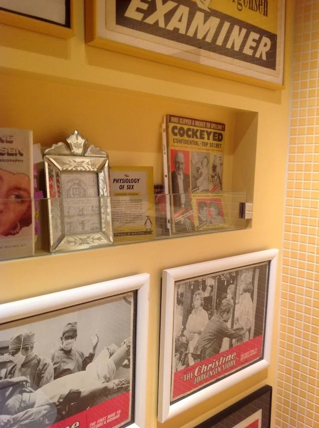 Glamorous is the right word. Standing in the CJMB, surrounded by dozens of portraits of Jorgensen, I was struck by the glam and the glitz, the furs and the crystals, the elegant eyebrows and the perfectly curled lips. The CJMB is a tiny space—maybe 80 square feet of sunshine-yellow tile—and every inch is covered in Jorgensen.